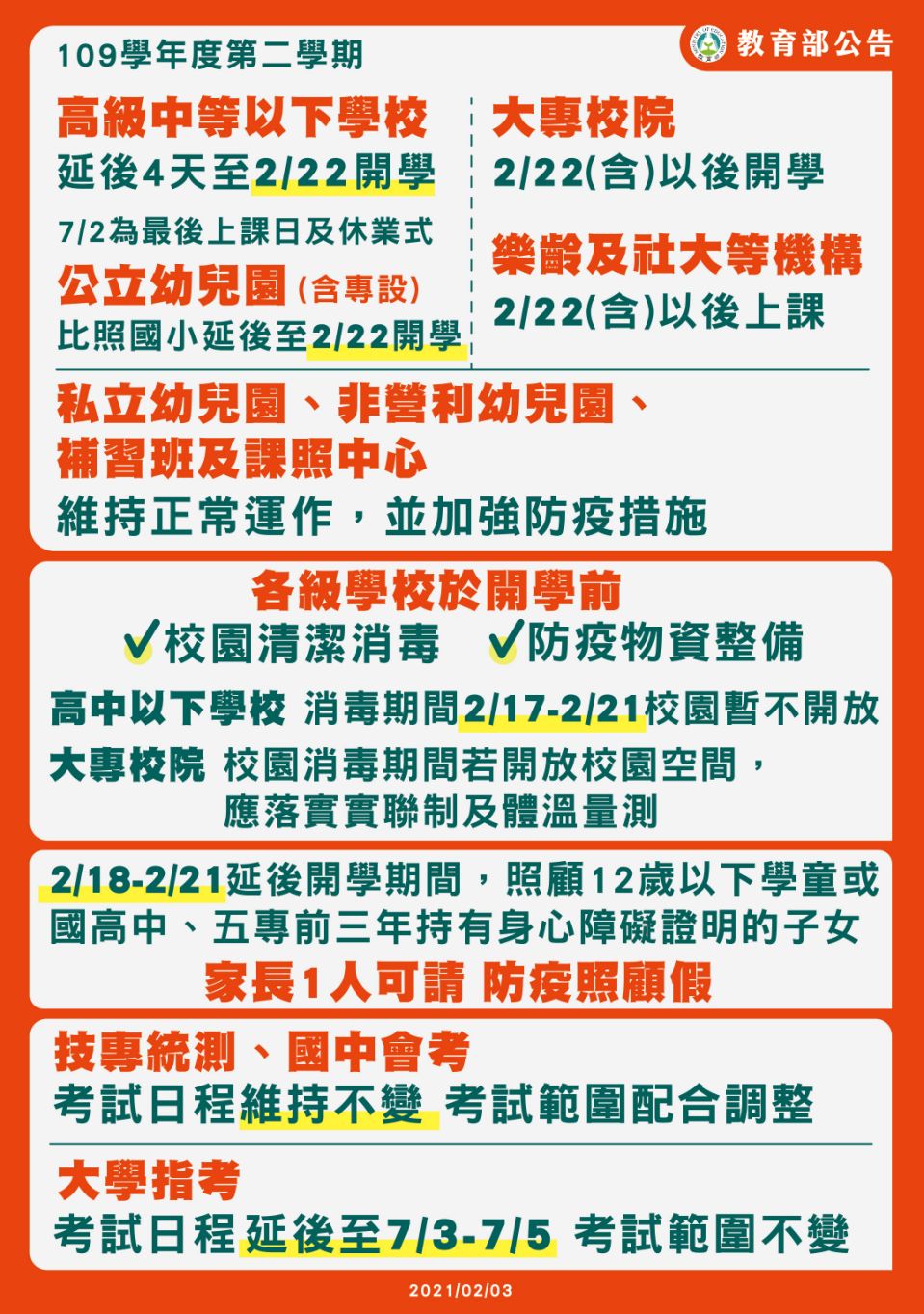 高中以下學校延至2/22開學 指考延後到7/3-7/5辦理 2021-02-03 https://tw.news.yahoo.com/%E5%90%84%E7%B4%9A%E5%AD%B8%E6%A0%A1%E5%BB%B6%E8%87%B3222%E6%97%A5%E9%96%8B%E5%AD%B8-%E6%8C%87%E8%80%83%E5%BB%B6%E5%BE%8C%E5%88%B073-75%E8%BE%A6%E7%90%86-061720060.html Back